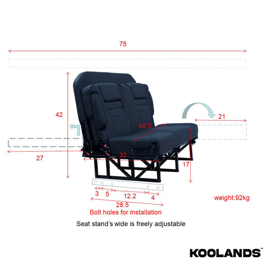 Discover the KOOLANDS USDOT safety certified multi-functional seat, which is equipped with three-point seatbelts and spans a width of between 19 and 55 inches, making it an ideal fit for vans, buses, or trailers. Its robust design allows it to seamlessly convert into a comfortable bed, measuring 76 inches in length. With legs that are designed to align perfectly with the width of your mounting needs.
